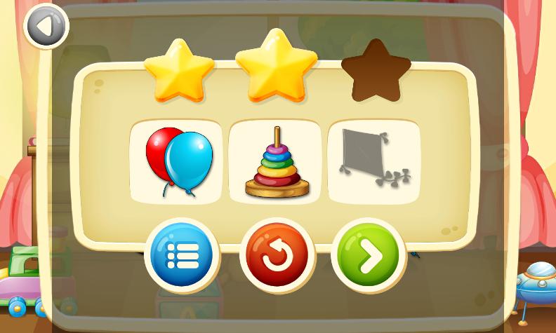 - "Arcade game" career mode - each of the topics has 9 levels to beat, each level has different spacing of the images on the board. At the beginning of the child receives the 3 pairs of images which takes the first level. For each level, depending on the accuracy in finding pairs of baby receives from 1 to 3 stars and be between 1 - 3 images. All images owned participate in subsequent games.